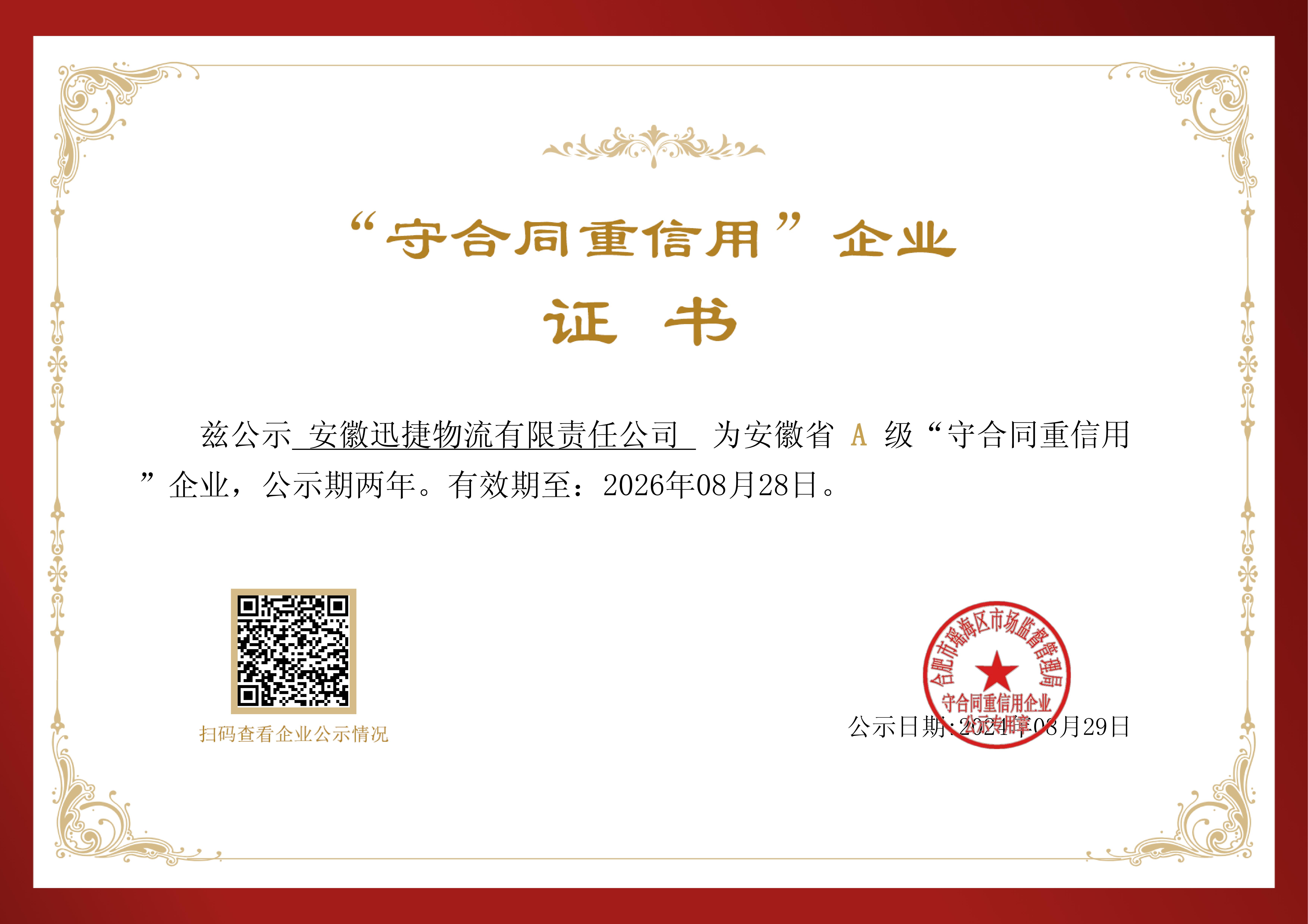 迅捷供應鏈公司獲評“AAA級重合同守信用企業”